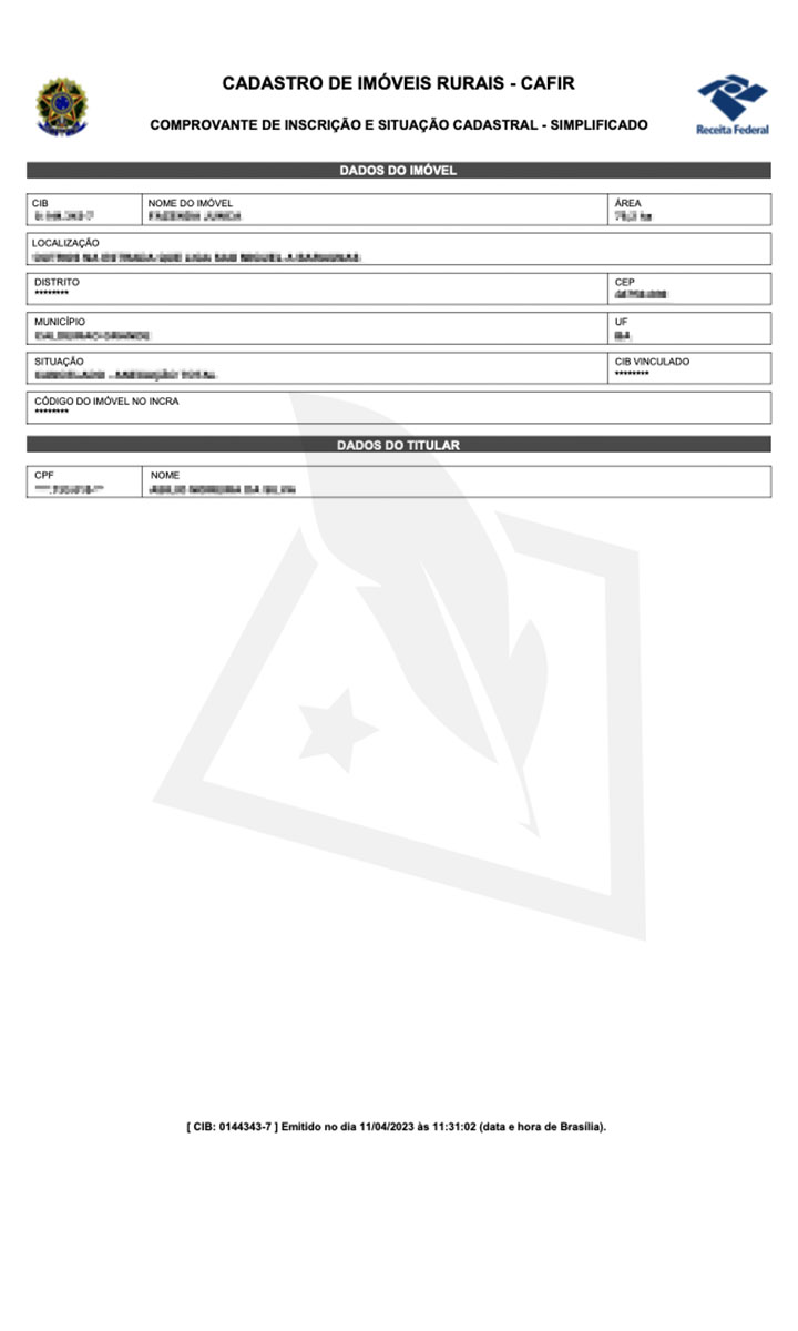O CAFIR (Cadastro de Imóveis Rurais) é um registro eletrônico mantido pela Receita Federal que contém informações sobre a propriedade rural e sua localização, bem como os dados de seus proprietários.